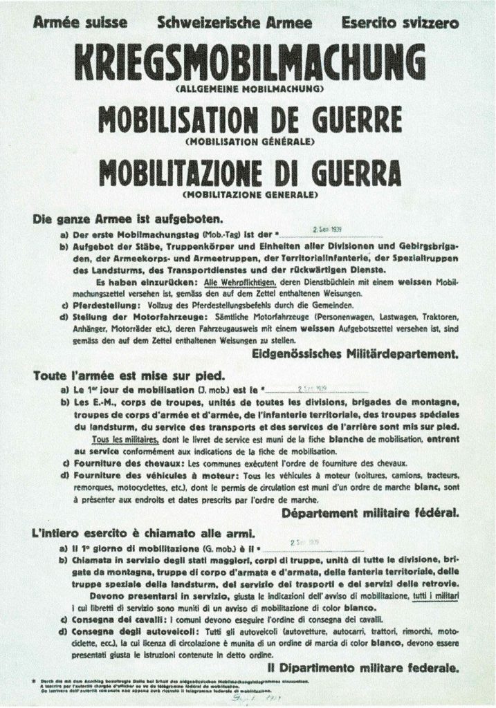 Affiche de mise sur pied pour la mobilisation générale de septembre 1939 (source: Bibliothèque nationale suisse)