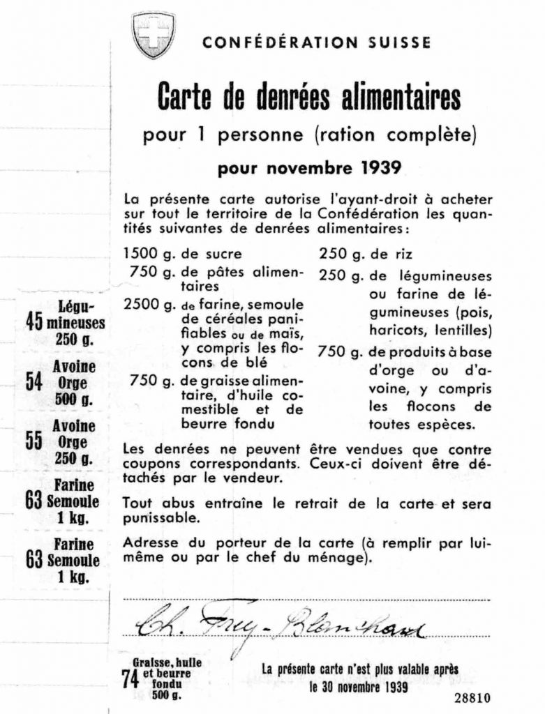 René Blanchard se souvient: “Le 3 septembre 1939, j’ai 26 ans, c’est le jour de la Foire de Chaindon, la mobilisation est décrétée. Je me rends à cheval à Tavannes, j’embarque dans un train et voyage avec ma monture jusqu’à Peseux, où mon escadron prête serment dans la soirée. Puis de longs mois de service s’écoulent, dont en particulier quatre sur la frontière du Rhin. On n’a que de maigres congés, à peine arrivé à la maison, il faut repartir. Des tickets de rationnement sont distribués à la population, par exemple trois oeufs par mois.”