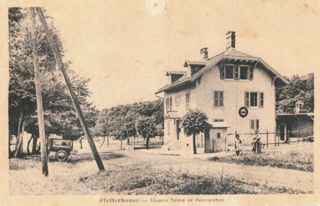 et le terrain de football de Pfetterhouse parallèle à la route, célèbre durant la dernière guerre. L’un des deux buts se trouvait sur territoire suisse, une aubaine pour les candidats à l’évasion lorsqu’on envoyait le ballon dans les buissons, récupéré par un complice qui le ramenait sur le terrain. Les Allemands transférèrent plus tard le stade de la frontière près de la gare de Pfetterhouse. (Source: Amitié sans frontière, André Dubail)